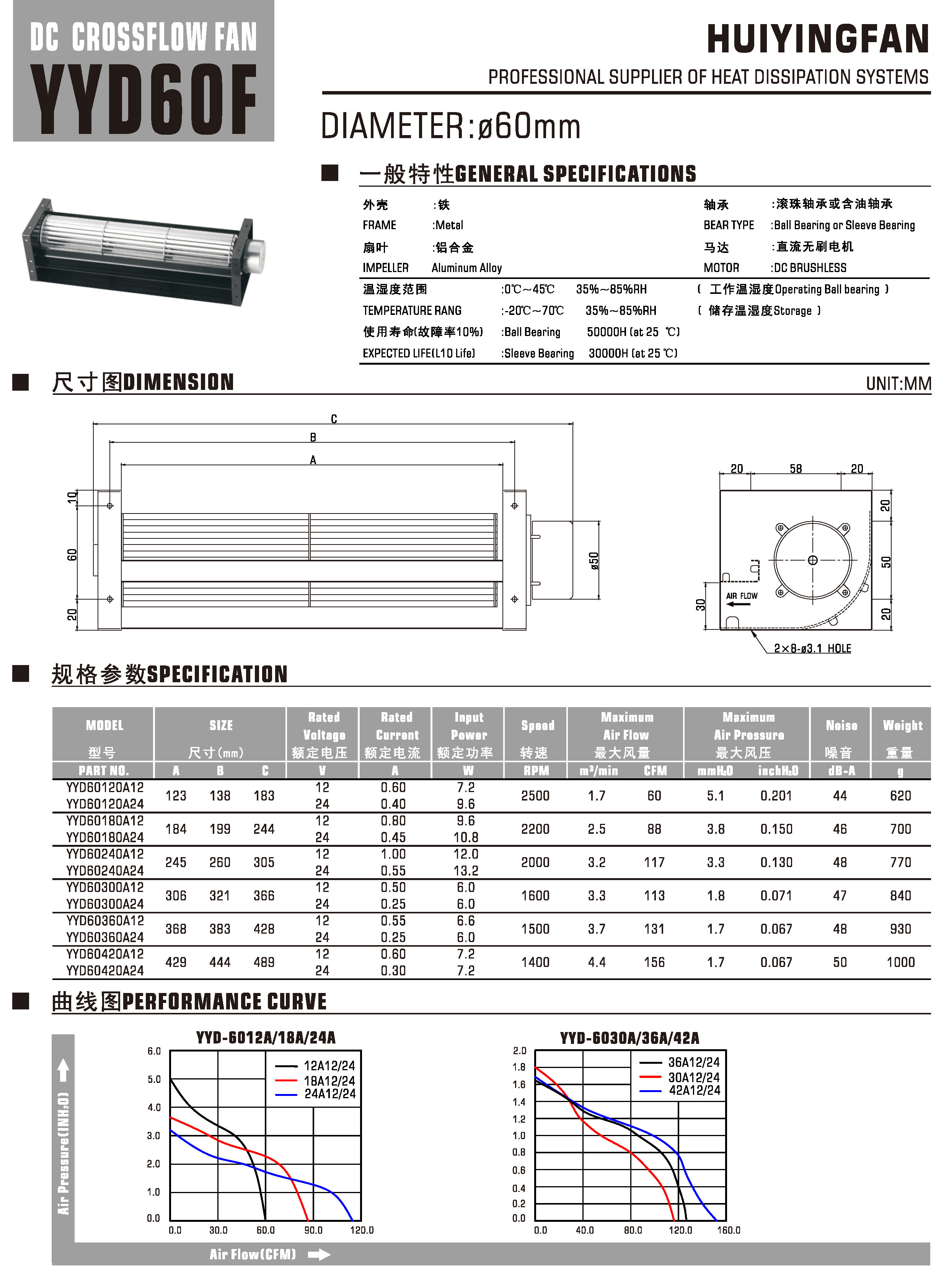 DC横流风扇YYD60F 常用于:冷柜设备、铁路设备、厨具设备、展示柜、广告机等; 适用行业:空气净化行业、暖风系统、通风散热等行业 叶轮:风扇叶轮采用铝镁合金,重量轻、高强度、风量大、噪音低、低震动、耐温佳、寿命长之优点, 轴承:原装进口轴承。
